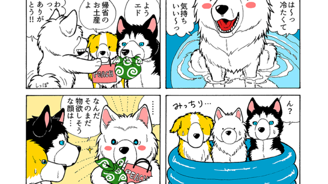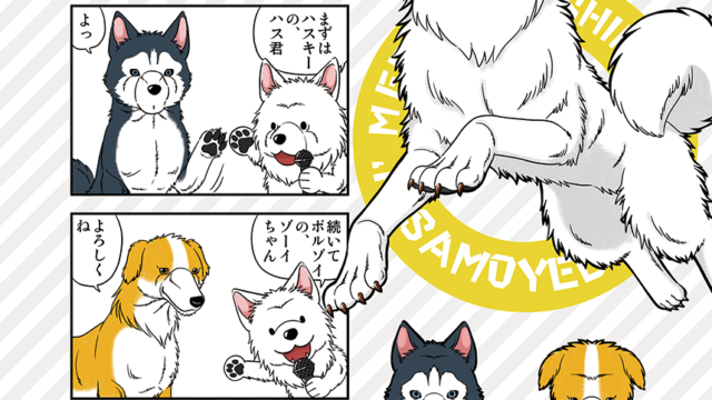 友人のご本に描かせていただいた、見た目はホワイト・心はブラックなサモエドくんの4コマです。